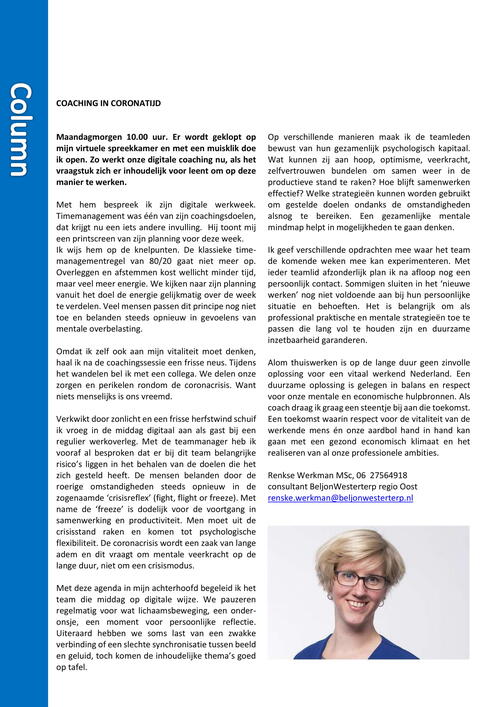 Omdat ik zelf ook aan mijn vitaliteit moet denken, haal ik na de coachingssessie een frisse neus. Tijdens het wandelen bel ik met een collega. We delen onze zorgen en perikelen rondom de coronacrisis. Want niets menselijks is ons vreemd.