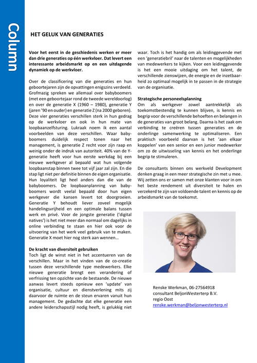 Toch ligt de winst niet in het accentueren van de verschillen. Maar in het vinden van de co-creatie tussen deze verschillende type medewerkers. Elke nieuwe generatie brengt een verandering of verfrissing ten opzichte van de bestaande. De nieuwe aanwas levert steeds opnieuw een ‘update’ van organisatie, cultuur en dienstverlening mits zij daarvoor de ruimte en de steun ervaren vanuit hun management. De gedachte dat elke generatie een andere leiderschapsstijl nodig heeft, is gelukkig niet waar. Toch is het handig om als leidinggevende met een ‘generatiebril’ naar de talenten en mogelijkheden van medewerkers te kijken. Voor een leidinggevende is het een mooie uitdaging om het talent, de verschillende zienswijzen, de energie en de inzetbaar-heid zo optimaal mogelijk in te passen in de strategie van de organisatie.