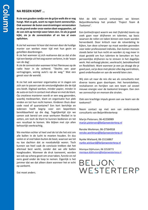 Wij zien uit naar de reis die we als consultants met diverse teams gaan doorlopen. Het herontdekken, revitaliseren en herijken van een team zal zoveel nieuwe energie voor de toekomst brengen. Dan zien we zonneschijn en mensen die stralen.