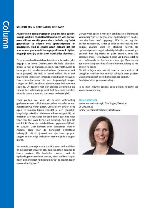 Alweer bijna een jaar geleden ging ons land op slot. In mijn werk als consultant Recruitment was dat wel even slikken; we zijn gewend om de hele dag fysiek gesprekken te voeren met opdrachtgevers en kandidaten. Had ik eerder nooit geloofd dat het voeren van goede sollicitatiegesprekken ook digitaal mogelijk zou zijn; onder druk wordt alles vloeibaar…