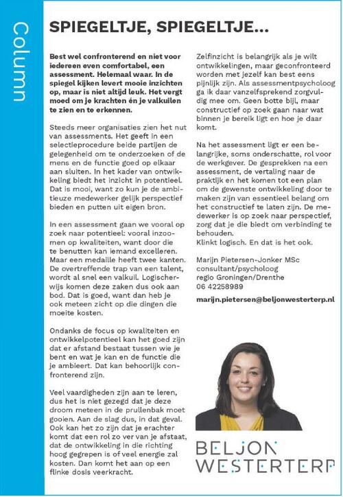 Best wel confronterend en niet voor iedereen even comfortabel, een assessment. Helemaal waar. In de spiegel kijken levert mooie inzichten op, maar is niet altijd leuk. Het vergt moed om je krachten én je valkuilen te zien en te erkennen.