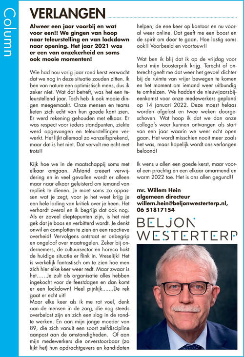 Wat ben ik blij dat ik op de vrijdag voor kerst mijn boosterprik krijg. Terecht of onterecht geeft me dat weer het gevoel dichter bij de ruimte van vrijer bewegen te komen en het moment om iemand weer uitbundig te omhelzen. We hadden de nieuwjaarsbijeenkomst voor onze medewerkers gepland op 14 januari 2022. Deze moest helaas worden afgelast en twee weken doorgeschoven. Wat hoop ik dat we dan onze collega’s weer kunnen ontvangen als start van een jaar waarin we weer echt open gaan. Het wordt misschien nooit meer zoals het was, maar hopelijk wordt ons verlangen beloond!