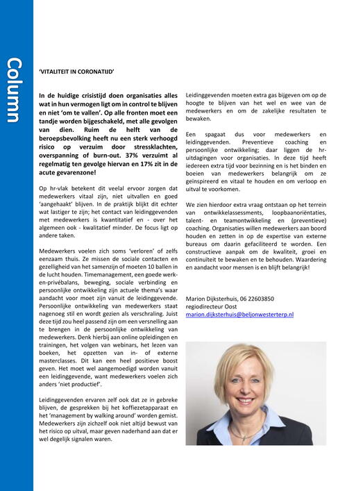Medewerkers voelen zich soms ‘verloren’ of zelfs eenzaam thuis. Ze missen de sociale contacten en gezelligheid van het samenzijn of moeten 10 ballen in de lucht houden. Timemanagement, een goede werk-en-privébalans, beweging, sociale verbinding en persoonlijke ontwikkeling zijn actuele thema’s waar aandacht voor moet zijn vanuit de leidinggevende. Persoonlijke ontwikkeling van medewerkers staat nagenoeg stil en wordt gezien als verschraling. Juist deze tijd zou heel passend zijn om een versnelling aan te brengen in de persoonlijke ontwikkeling van medewerkers. Denk hierbij aan online opleidingen en trainingen, het volgen van webinars, het lezen van boeken, het opzetten van in- of externe masterclasses. Dit kan een heel positieve boost geven. Het moet wel aangemoedigd worden vanuit een leidinggevende, want medewerkers voelen zich anders ‘niet productief’.