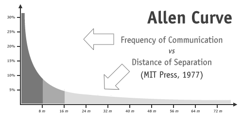Thomas Allen heeft in de jaren 70 onderzoek gedaan naar de relatie tussen fysieke afstand en de frequentie van communicatie. En dan blijkt inderdaad dat we vooral contact hebben met mensen die fysiek dichtbij zijn. De Allen curve beschrijft deze relatie (zie de grafiek) en deze is exponentieel. Een paar meter afstand meer of minder kan dus al een groot verschil maken in de hoeveelheid communicatie die tussen personen plaatsvindt. In een kantoorsetting spreken we dus veel vaker met collega’s in dezelfde ruimte, dan in een kamer verderop, laat staan met collega’s op een andere locatie.