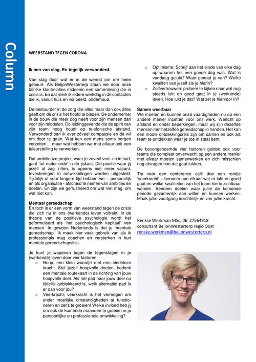 Van slag door wat er in de wereld om me heen gebeurt. Als BeljonWesterterp staan we door onze talrijke klantrelaties middenin een samenleving die in crisis is. En dat merk ik iedere werkdag in de contacten die ik, vanuit huis en via beeld, onderhoud. De bestuurder in de zorg die alles maar dan ook álles geeft om de crisis het hoofd te bieden. De ondernemer in de bouw die meer oog heeft voor zijn mensen dan voor zijn middelen. De leidinggevende die de spirit van zijn team hoog houdt op telefonische afstand. Verwonderd ben ik over zóveel compassie en de wil om door te gaan. Wat kan een mens soms bergen verzetten… maar wat hebben we met elkaar ook een teleurstelling te verwerken.